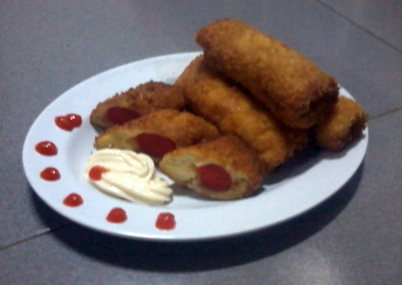 - Take a piece of bread, put a cheese and sausage then rolls the bread