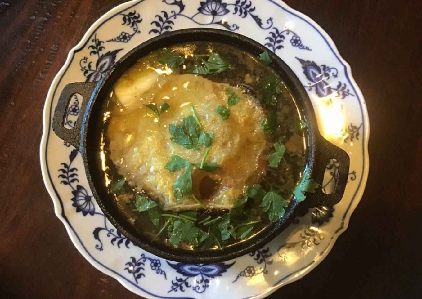 - Heat olive oil with thyme and crushed garlic clove in dutch oven, toast sour dough bread one minute each side, set aside. Next, peel, trim, slice whole yellow onions horizontally, carmelize onion halves, flat side down, 1/2 hour, set aside. Bring 4 cups of soup to boil, stir in 2 whipped eggs. Slide onions in beef egg drop soup,bring to low boil, cook 30 minutes with lid on till onion tops feel soft to the touch. Add pepper to taste: salt is already in the beef bouillion cubes and the cheese.