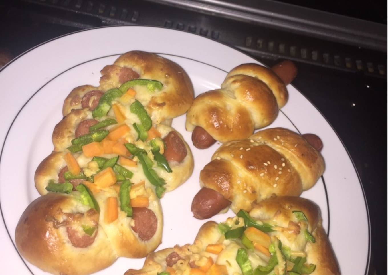 - Roll the other sausage around the dough leave the dough for ten minutes the egg wash the top surface and some cheese,grated carrot and capsicum