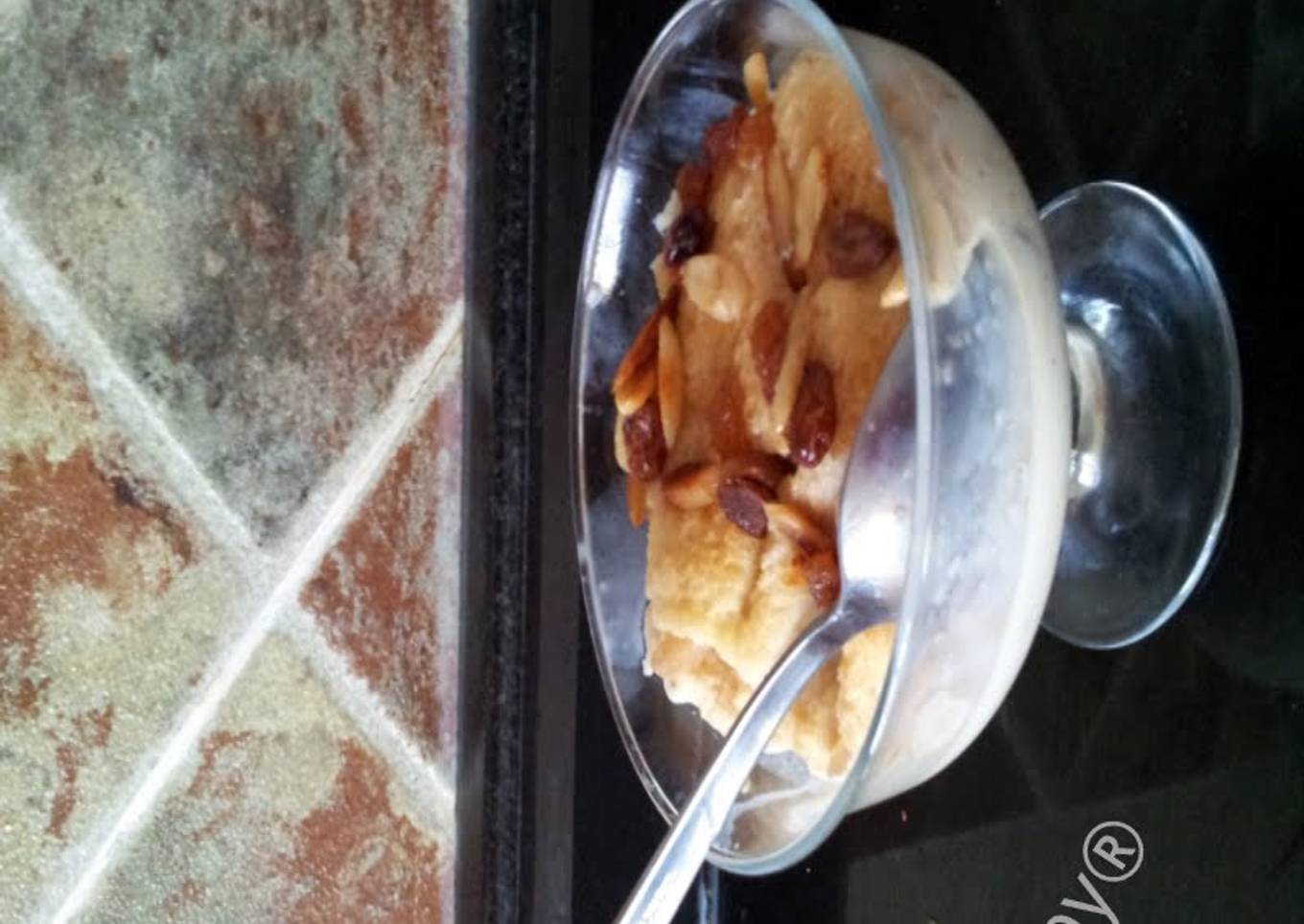 - fry some sliced almonds and a handful of raisins in some ghee or butter. Sprinkle between layers of bread and on top.